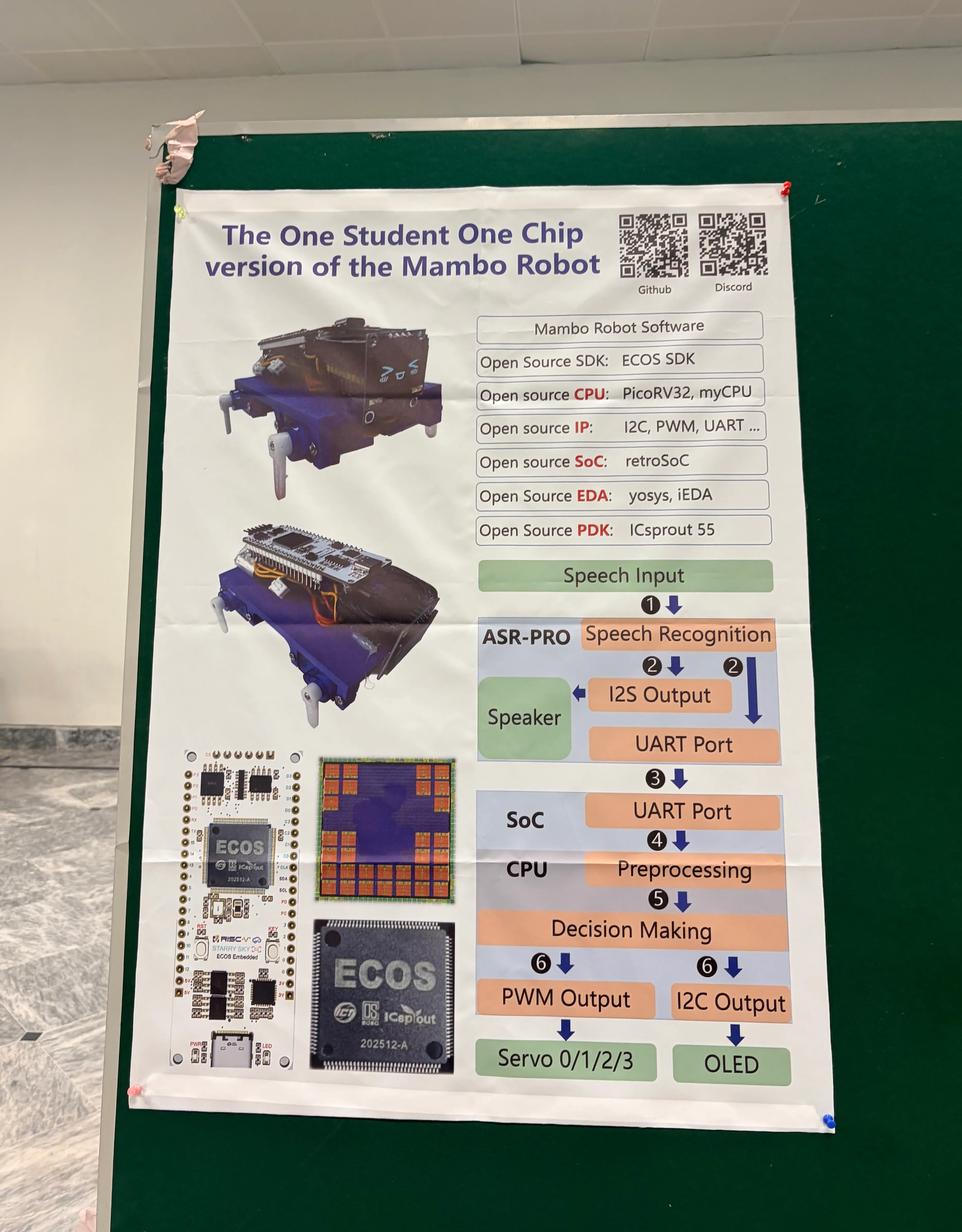 同时,“一生一芯”团队也在会上带来了有关于ECOS Studio的tutorial报告。报告向观众系统介绍了ECOS Studio——一套整合了开源EDA、开源IP和开源PDK的开源芯片全流程设计解决方案,展示了如何使用开源工具完成从RTL代码到芯片版图的全过程。讲解了ECOS Studio的三大开源支柱:ECC工具链,实现了从RTL到GDSII的全自动化设计流程;开源IP库,提供了预验证的RISC-V SoC模板及通用外设IP;以及团队维护的ICsprout55开源55nm PDK,兼顾工业级性能与学术流片成本。现场还以RetroSoC为例,展示了这款全开源RISC-V芯片如何基于该流程成功流片,并于2025年12月回片验证。报告还分享了ECOS Studio与“一生一芯”项目的融合,介绍未来将为开源社区和大规模芯片设计教育提供相应平台。这场报告呈现了团队积累数年的开源成果及其构建的开源芯片生态,为实现真正的“开源芯片敏捷设计全流程”画上了重要的一笔。